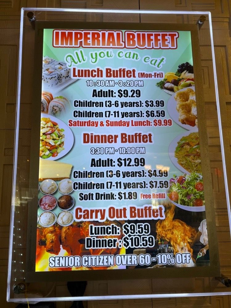 Introducing the menu at Imperial Buffet, a Chinese buffet located in Erie, PA, known for its wide variety of Asian dishes and more. The restaurant offers vegetarian, beef, chicken, and seafood options, along with sushi and a Mongolian BBQ station. Customers praise the freshness and taste of the food, highlighting favorites like bourbon chicken, steak tips, and Crab Rangoon. The atmosphere is cozy, with friendly wait staff and fast service. While some reviews mention it as a typical Chinese buffet, overall, Imperial Buffet is recommended for its good value for the price, clean environment, and diverse selection. With positive feedback on the hibachi options, alcohol availability, and efficient service, Imperial Buffet is a top choice for those looking for a satisfying all-you-can-eat dining experience.